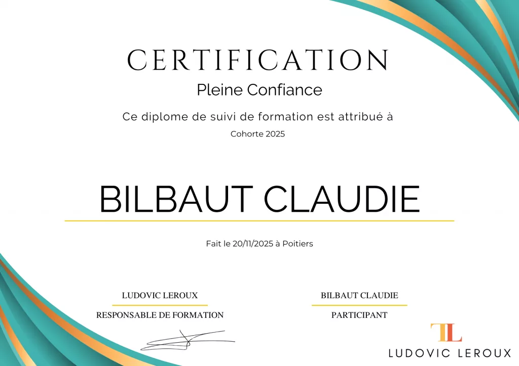 👉 je suis officiellement certifiée Coach Pleine Confiance, une certification délivrée par Ludovic Leroux et la cohorte 2025.